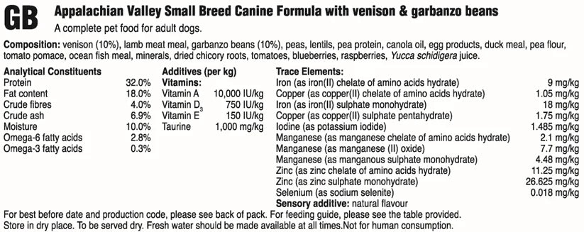 Appalachian Valley hundafóður fyrir smærri tegundir inniheldur dádýrakjöt og kjúklingabaunir. Auðmeltanleg dádýrakjöt og litlar fóðuragnir gera þessa uppskrift auðvelda fyrir maga og tennur smáhunda. Uppskriftin er rík af próteini og fitu og veitir þá orku sem virkir smáhundar þurfa. Blandan er einnig trefjarík sem styður við heilbrigða meltingu. Dádýrakjöt er magurt, hátt í próteinum, lágt í fitu, góð uppspretta af B-vítamínum, zink, fosfór, og járni en þessi næringarefni gegna mikilvægum hlutverkum í líkama gæludýra og stuðla að almennri heilsu og vellíðan. Dádýrakjöt er sjaldgæfur próteingjafi, sem getur oft gagnast gæludýrum með fæðuofnæmi eða óþol. Ef þú átt stóra tegund og vilt fóður með dádýrakjöti þá er þetta fóður einnig hæft hundum á öllum aldri og af öllum tegundum.