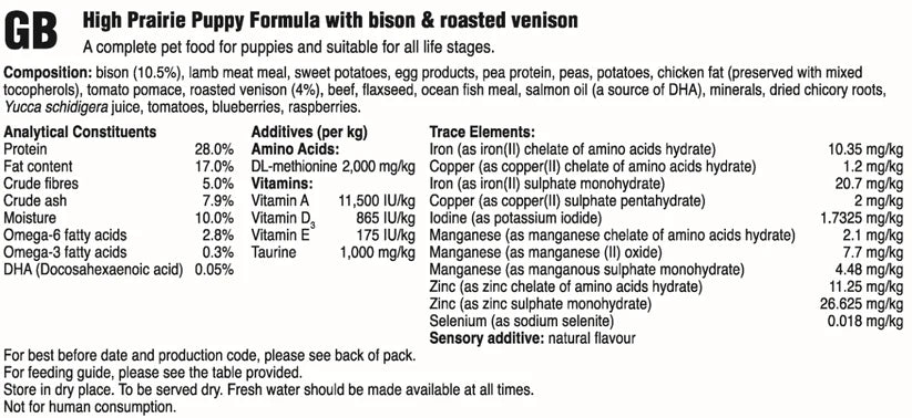 High Prairie hvolpafóður inniheldur ristað hágæða vísundakjöt, nautakjöt og villt ristað dádýr. Vísundakjöt er ríkt af nauðsynlegum amínósýrum sem hjálpa til við að byggja sterka vöðva og efla almenna heilsu. Kjötið er ríkt af járni, seleníi og zinki en þessi steinefni gegna mörgum mikilvægum hlutverkum í líkama hvolpa. Járn leikur mikilvægt hlutverk í myndun rauðra blóðkorna, á meðan seleníum og zink eru nauðsynleg fyrir viðhald heilbrigðs ónæmiskerfis. Formúlan er pökkuð af alvöru kjöti og gefur ríkt villt bragð sem hundar á öllum aldri hafa sterka eðlislæga löngun í. Formúlan inniheldur DHA Omega-3 fitusýrur og öll næringarefni sem hvolpar þurfa nauðsynlega á að halda til að vaxa og dafna með heilbriðgum hætti. Minni fóðuragnir auðvelda hvolpum að njóta næringarefnanna. Næringarleg samsetning og DHA innihald gerir þetta fóður einnig frábært fyrir hvolpafullar tíkur, þær sem nýlega hafa gotið og aðra fullorðna hunda.